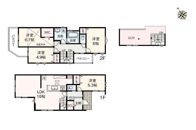 1階 LDK18畳 / 1階 洋室5.3畳 / 2階 洋室6.7畳 / 2階 洋室6畳 / 2階 洋室4.9畳 |