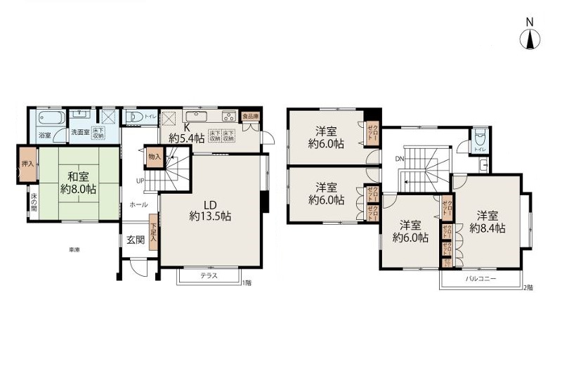 1階 LD13.5畳 / 1階 K5.4畳 / 1階 和室8.0畳 / 2階 洋室8.4畳 / 2階 洋室6.0畳 3部屋 |