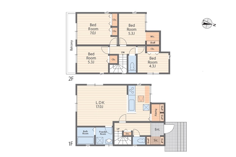| 間取内容 | 1階 LDK17畳 / 2階 洋室7畳 / 2階 洋室5.3畳 2部屋 / 2階 洋室4.3畳 | ||