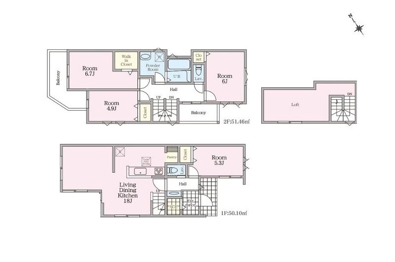 1階 LDK18.0畳 / 1階 洋室5.3畳 / 2階 洋室6.7畳 / 2階 洋室6.0畳 / 2階 洋室4.9畳 |