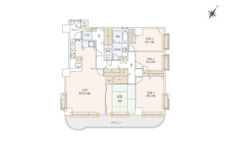 LDK19.2畳 / 和室8.0畳 / 洋室9.2畳 / 洋室6.3畳 / 洋室4.8畳 |