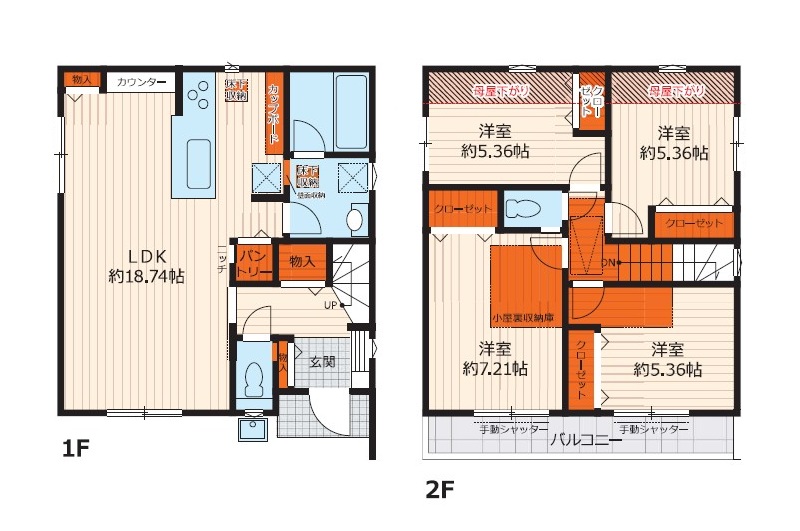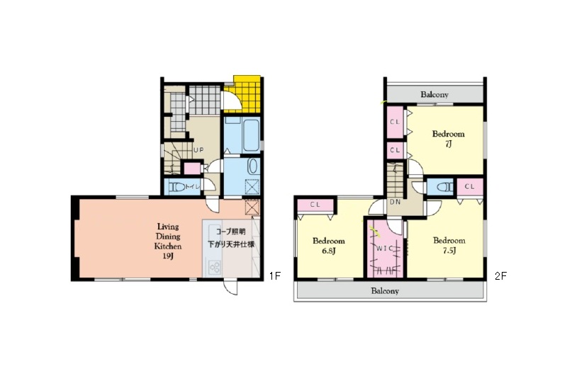 1階 LDK19畳 / 2階 洋室7.5畳 / 2階 洋室7畳 / 2階 洋室6.8畳 |