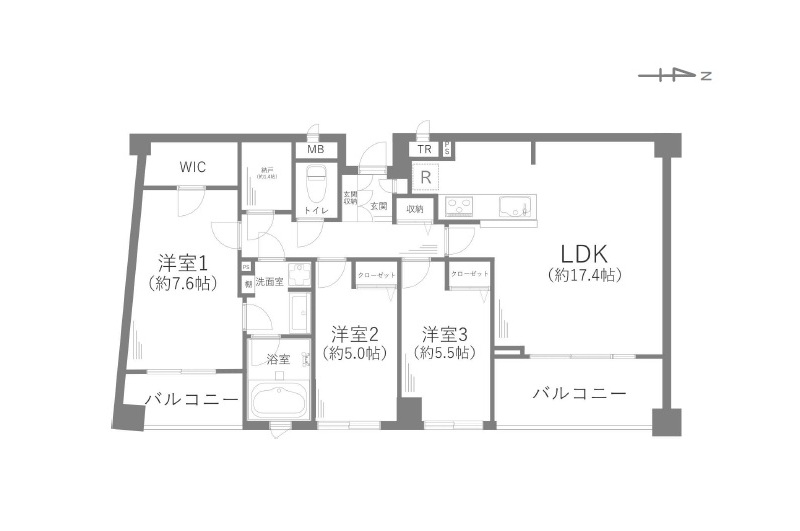 LDK17.4畳 / 洋室7.6畳 / 洋室5.5畳 / 洋室5畳 |