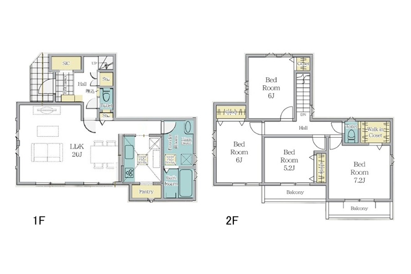1階 LDK20畳 / 2階 洋室7.2畳 / 2階 洋室6畳 2部屋 / 2階 洋室5.2畳 |