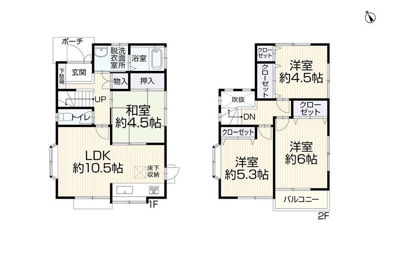 1階 LDK10.5畳 / 1階 和室4.5畳 / 2階 洋室6畳 / 2階 洋室5.3畳 / 2階 洋室4.5畳 |