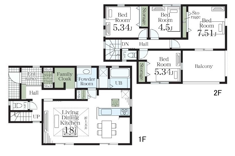 1階 LDK18.0畳 / 2階 洋室7.5畳 / 2階 洋室5.3畳 2部屋 / 2階 洋室4.5畳 |