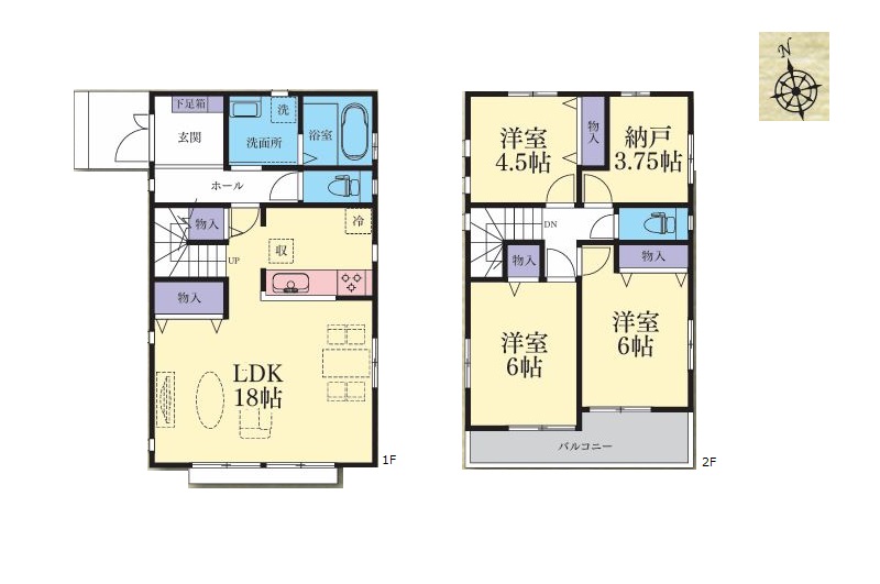 1階 LDK18.0畳 / 2階 洋室6.0畳 2部屋 / 2階 洋室4.5畳 / 2階 S3.7畳 |