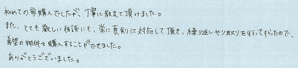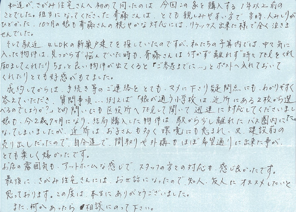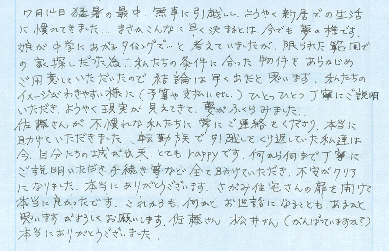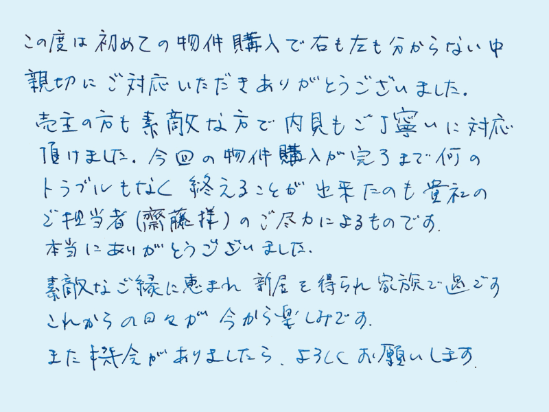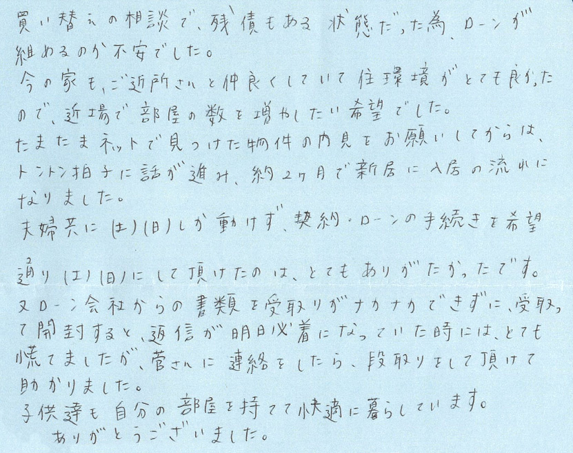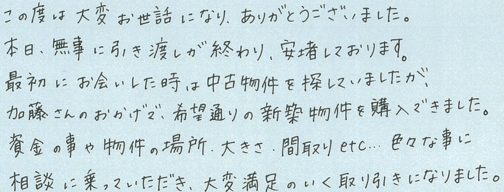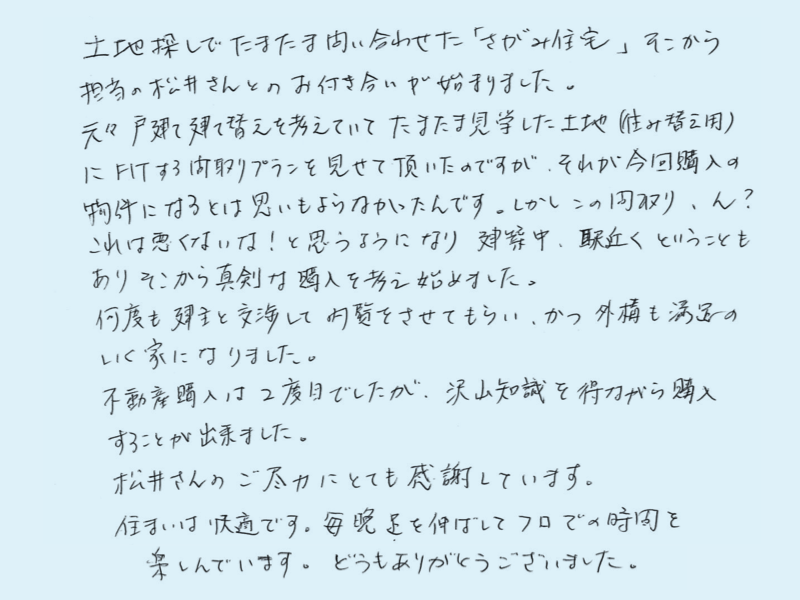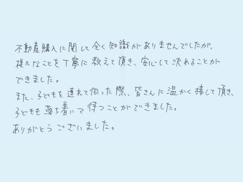 親身に相談に乗って下さり、住宅購入まで大きな不安なく迎えられたこと、大変感謝しております。2019年9月 | M様