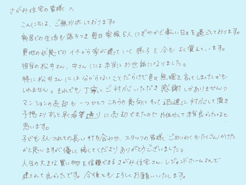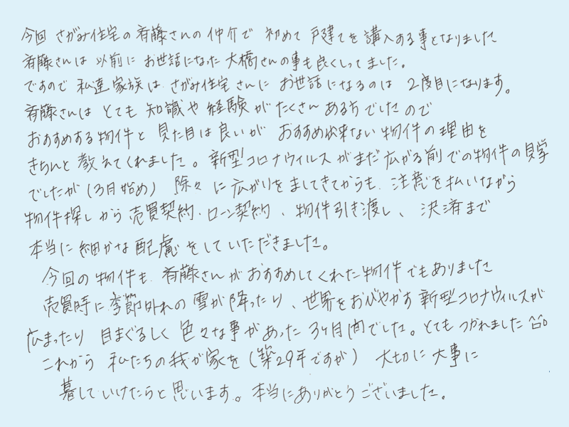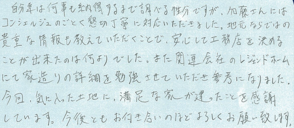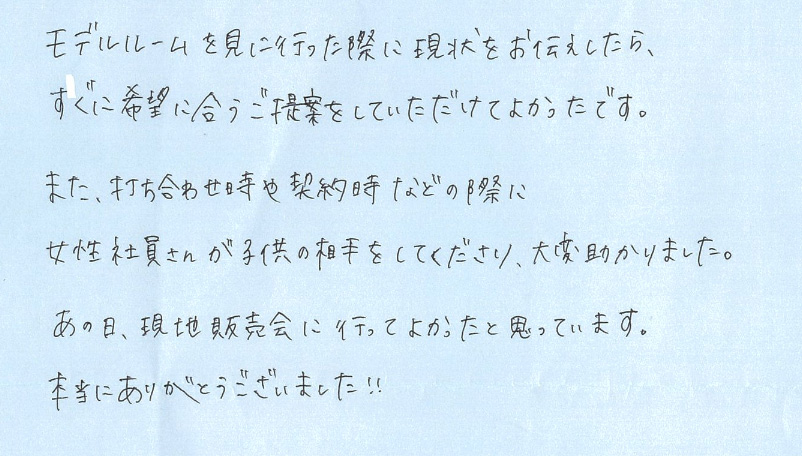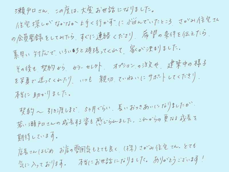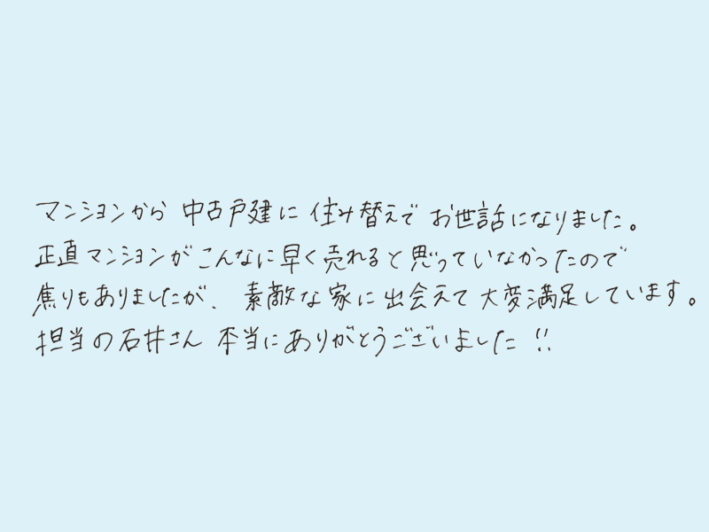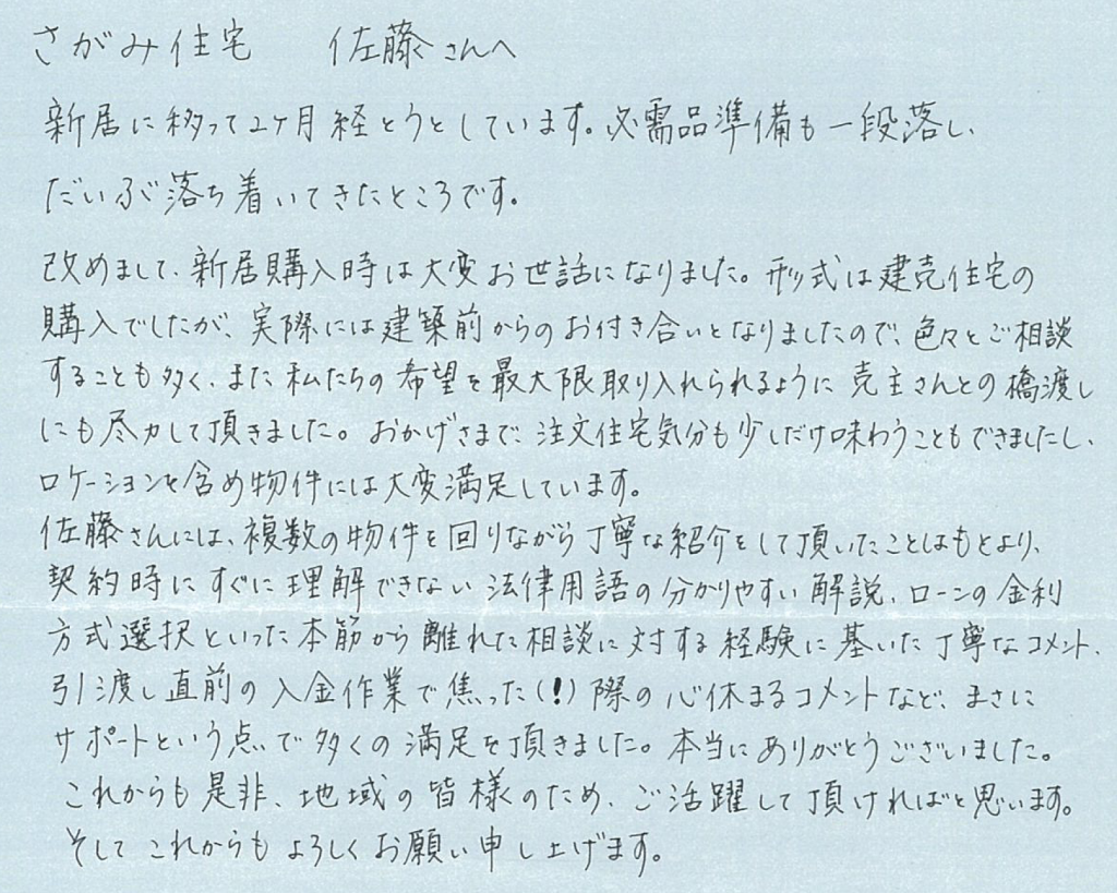 親身に相談に乗って下さり、住宅購入まで大きな不安なく迎えられたこと、大変感謝しております。2019年9月 | M様