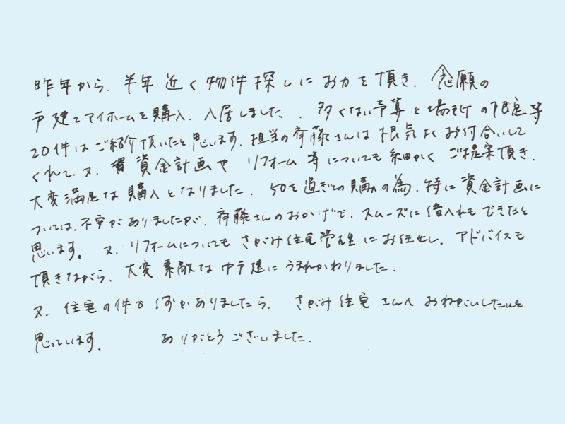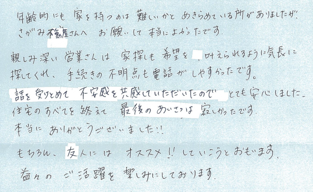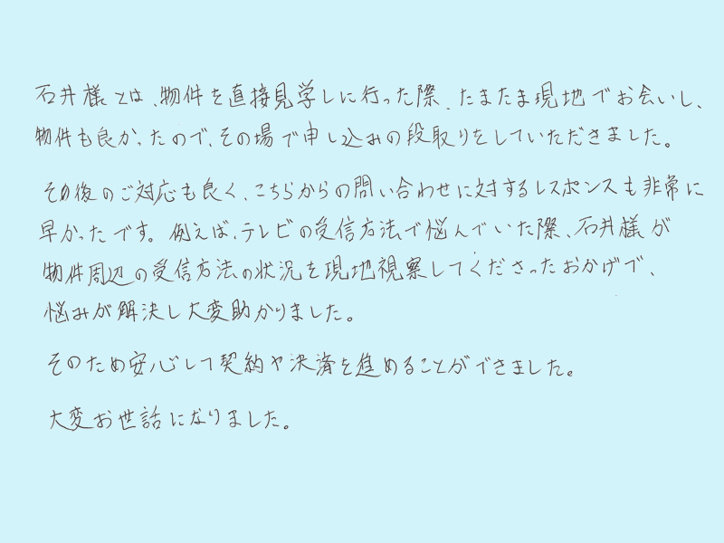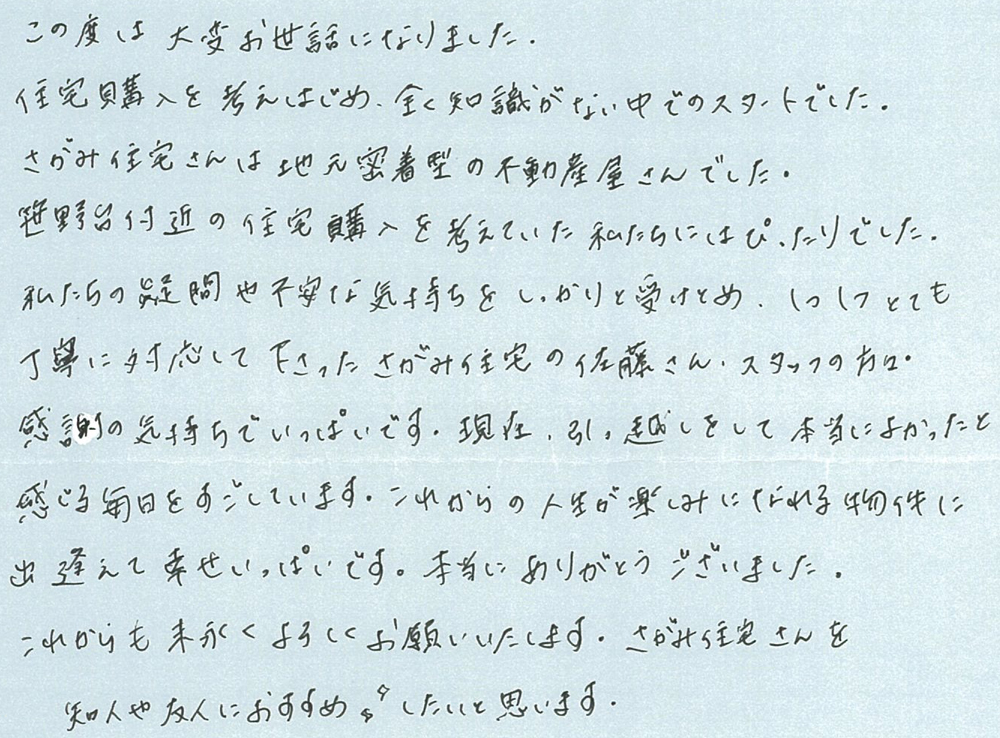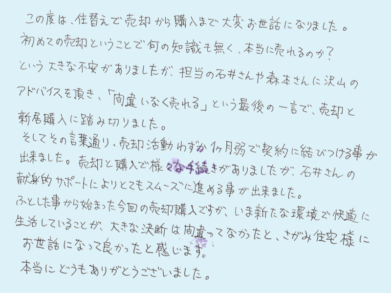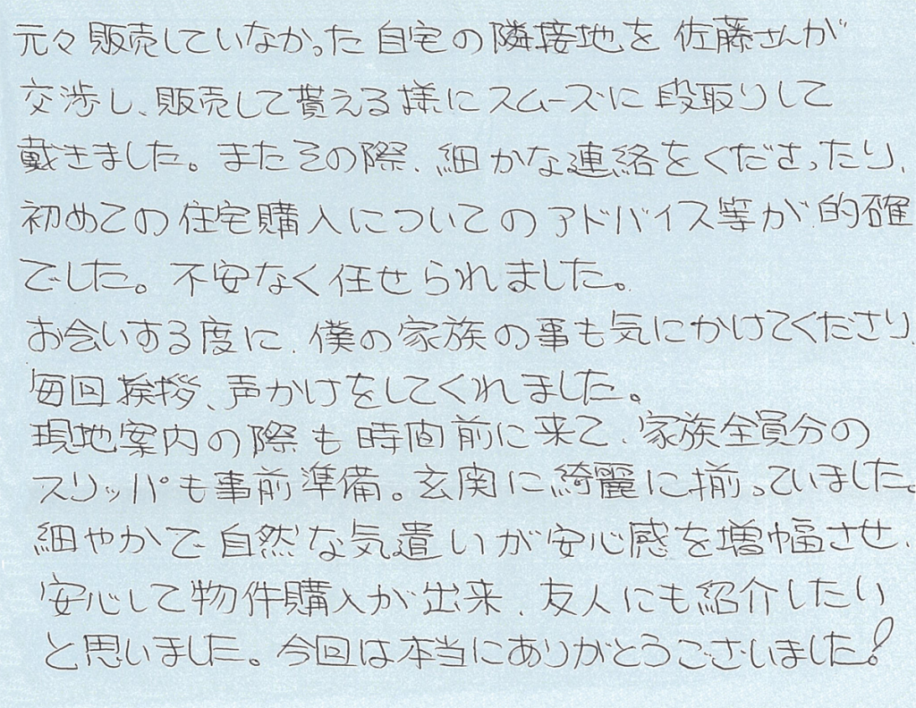 自然な気遣いが安心感を増幅させ安心して物件購入が出来、友人にも紹介したいと思いました。2016年11月 | S様