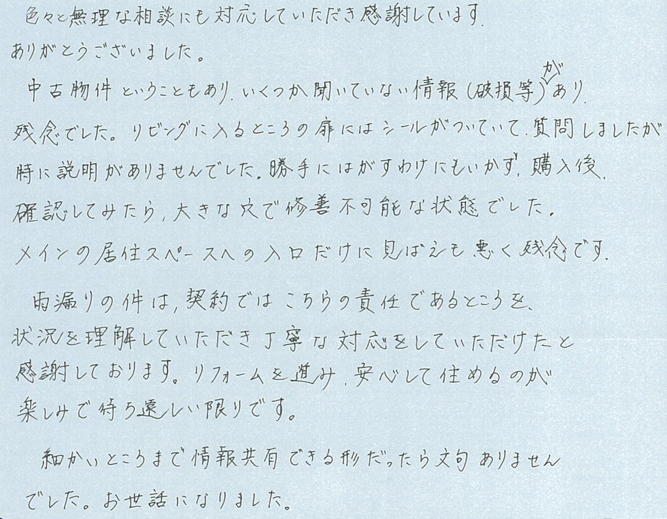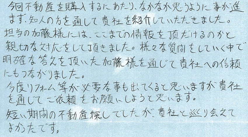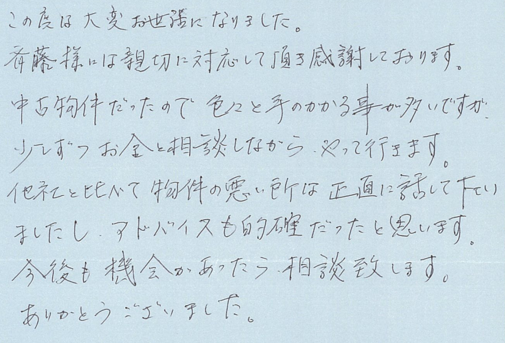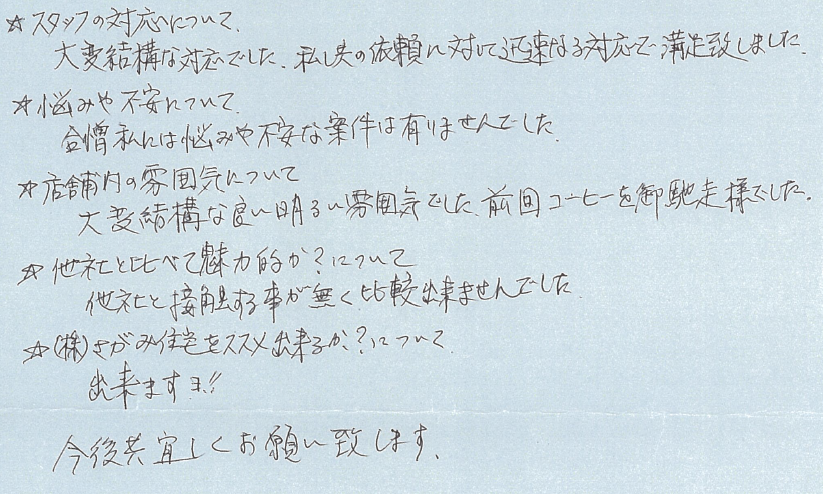 他社に比べて物件の悪い所は正直に話して下さいましたし、アドバイスも的確だったと思います。2015年11月 | K様