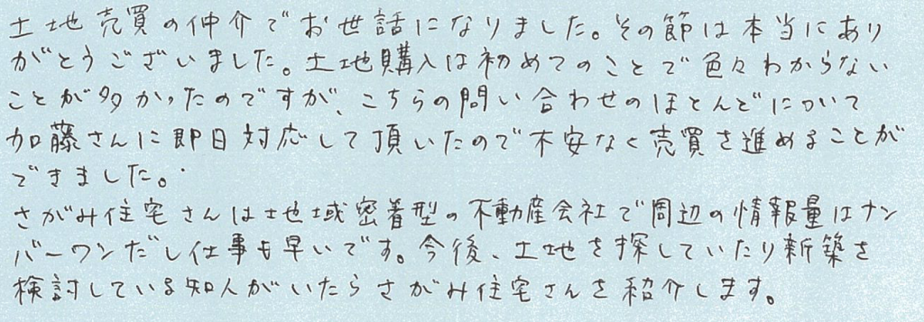 この度は満足のいく土地の紹介から契約までお力お貸しいただきありがとうございました。2023年4月 | K様