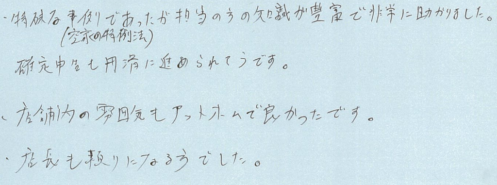三ツ境エリアに密着している貴社こその融通のきく対応で非常に満足しております。2023年9月 | S様