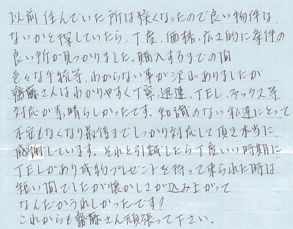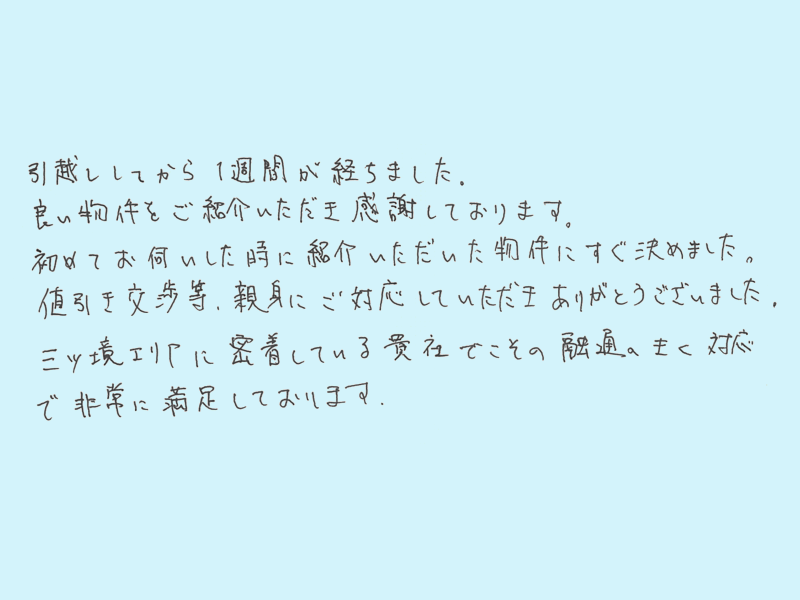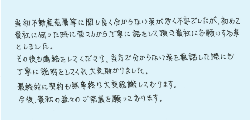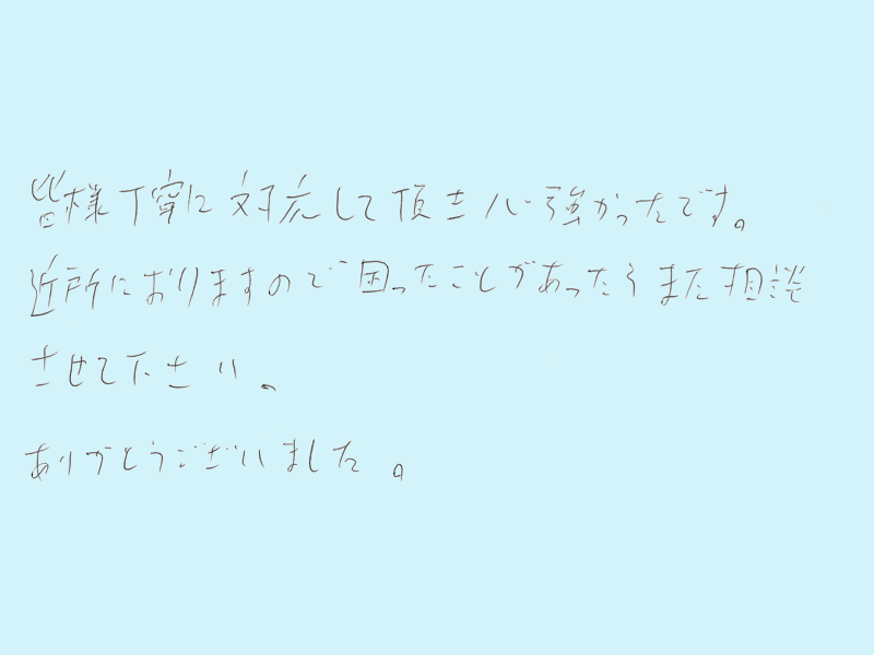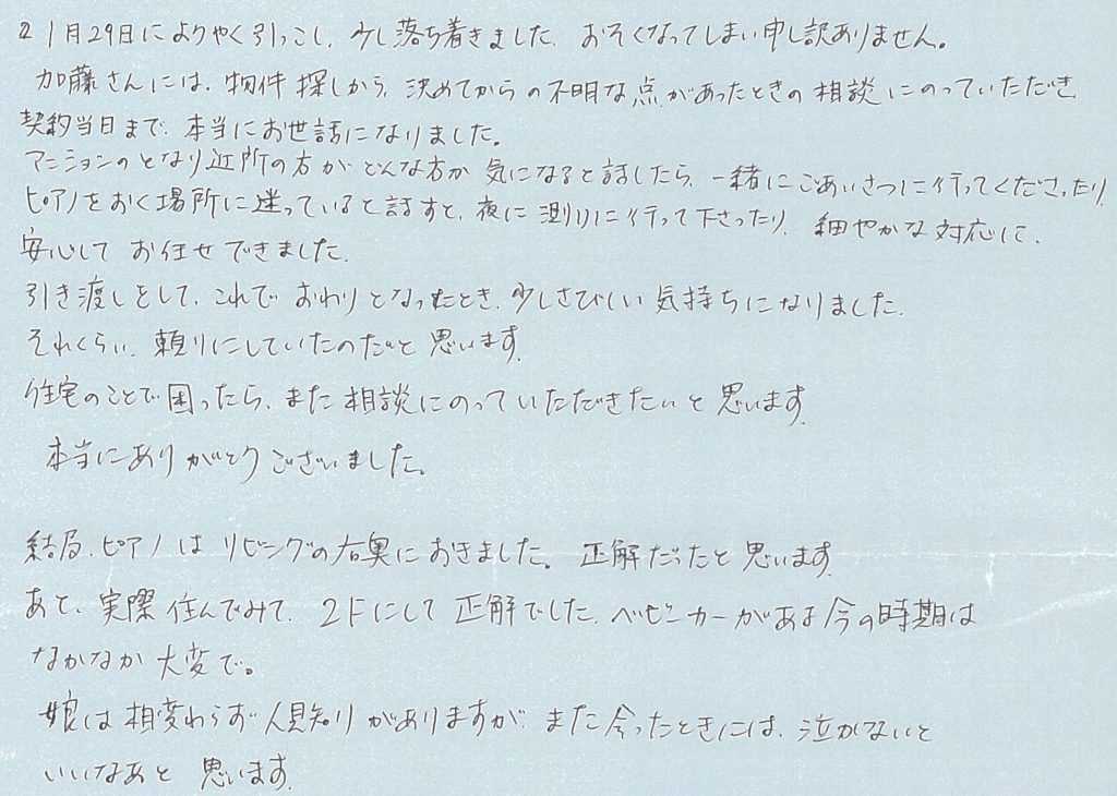 内見から引き渡しまで丁寧にご対応頂きました。2020年8月 | Y様