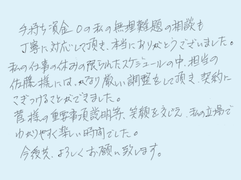 手持ち資金0の無理難題にも丁寧に対応して頂き、本当にありがとうございました。2019年12月 | M様