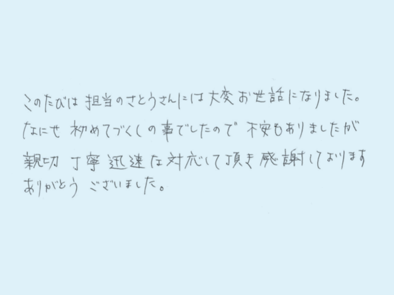 大変お世話になりました。親切かつ誠意ある対応でした。2019年9月 | S様