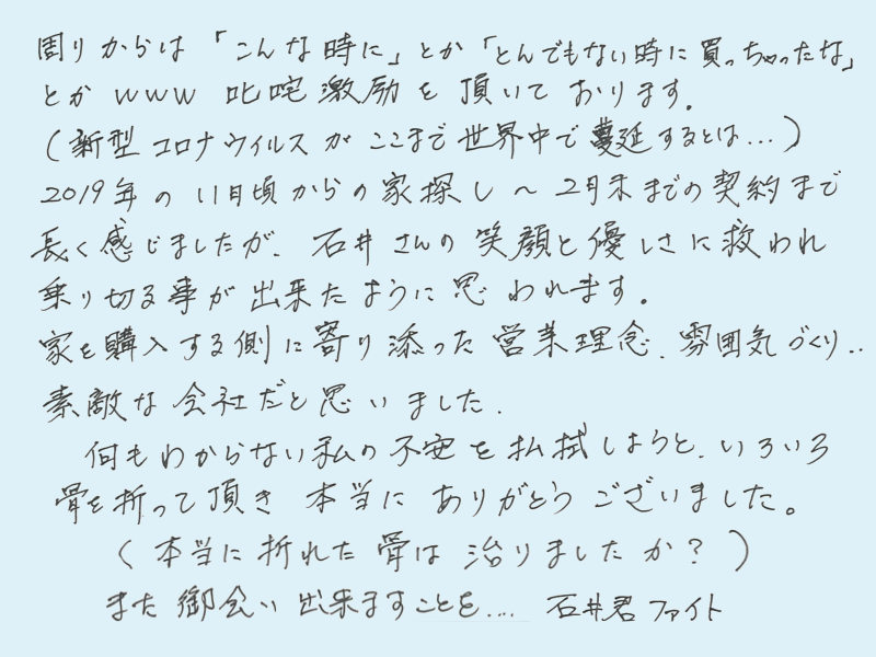 家を購入する側に寄り添った営業理念、雰囲気づくり・・素敵な会社だと思いました。2020年4月 | K様