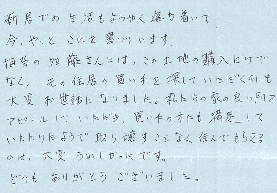 土地の購入だけでなく、元の住居の買い手を探して頂くのにも大変お世話になりました。2015年8月 | I様