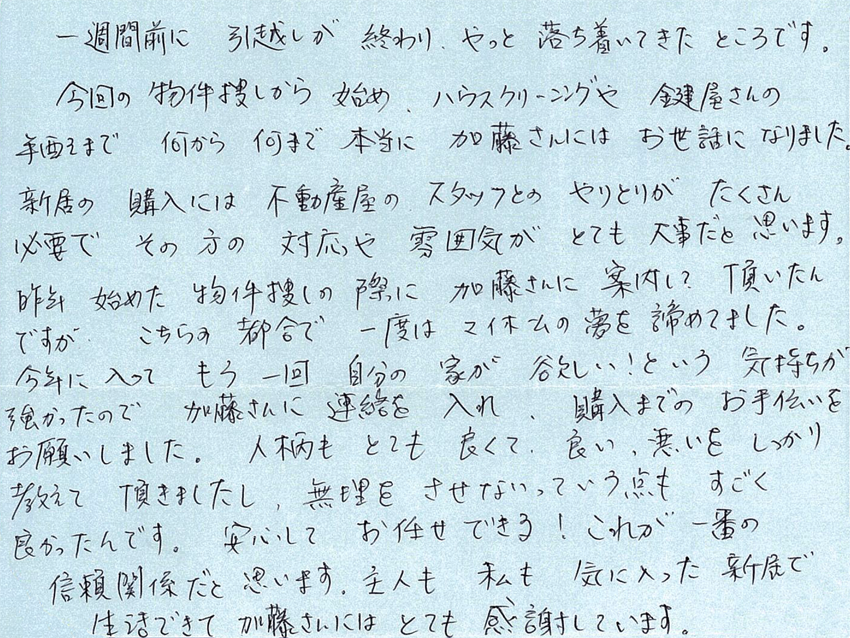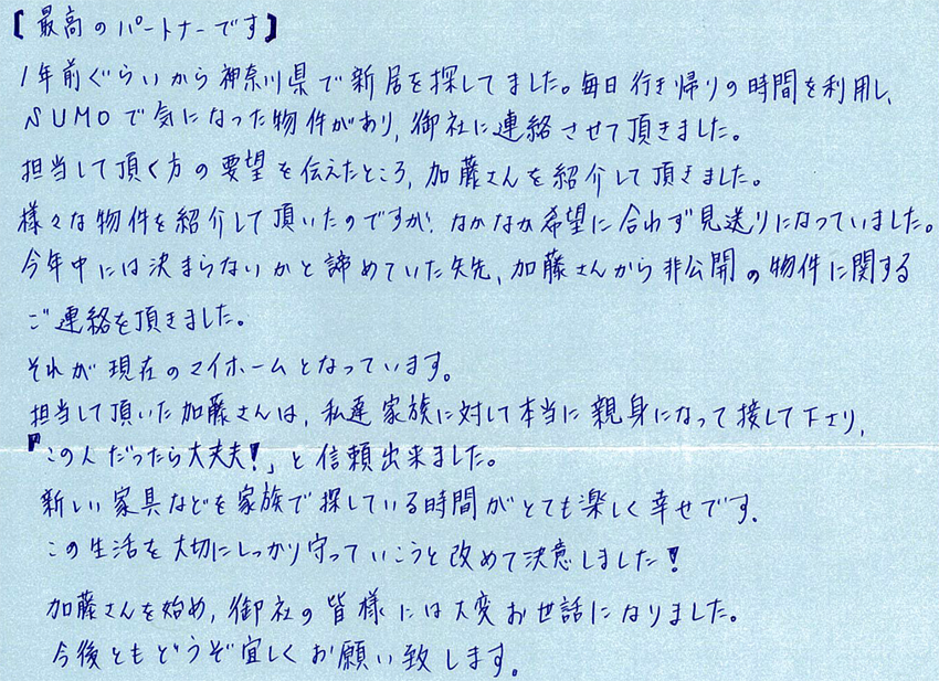 契約のみならず、契約後の事についてまで尽力して頂きました。2015年10月 | N様